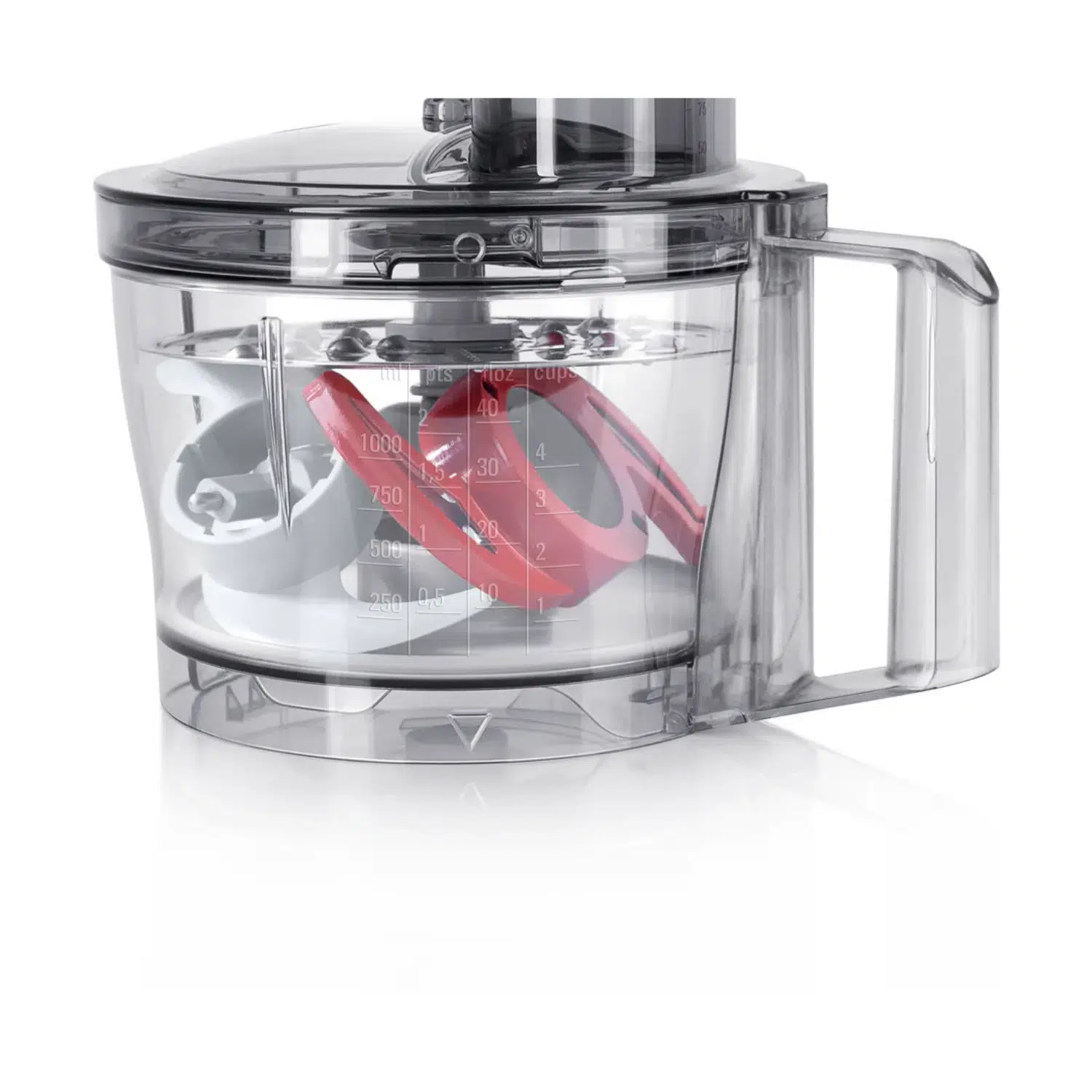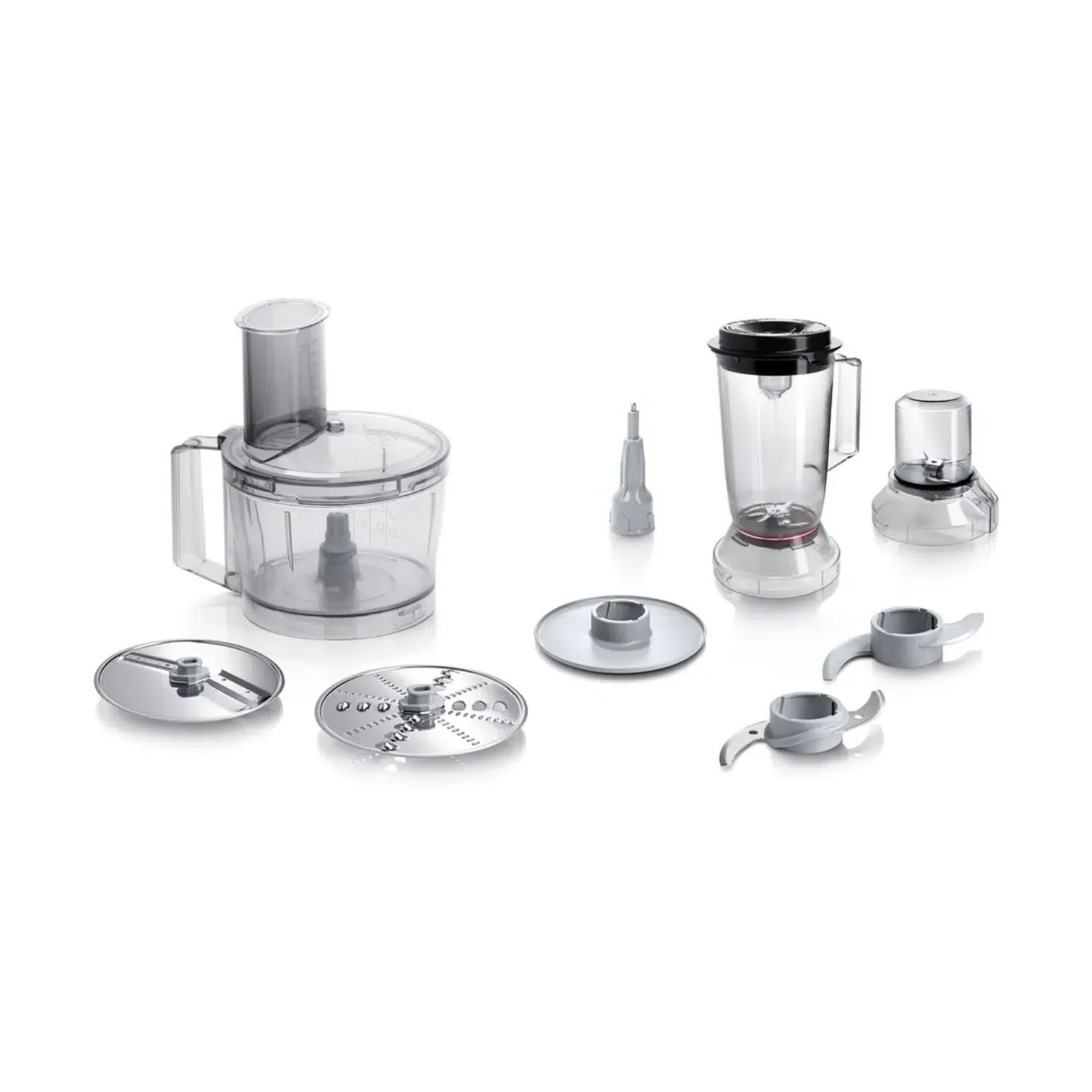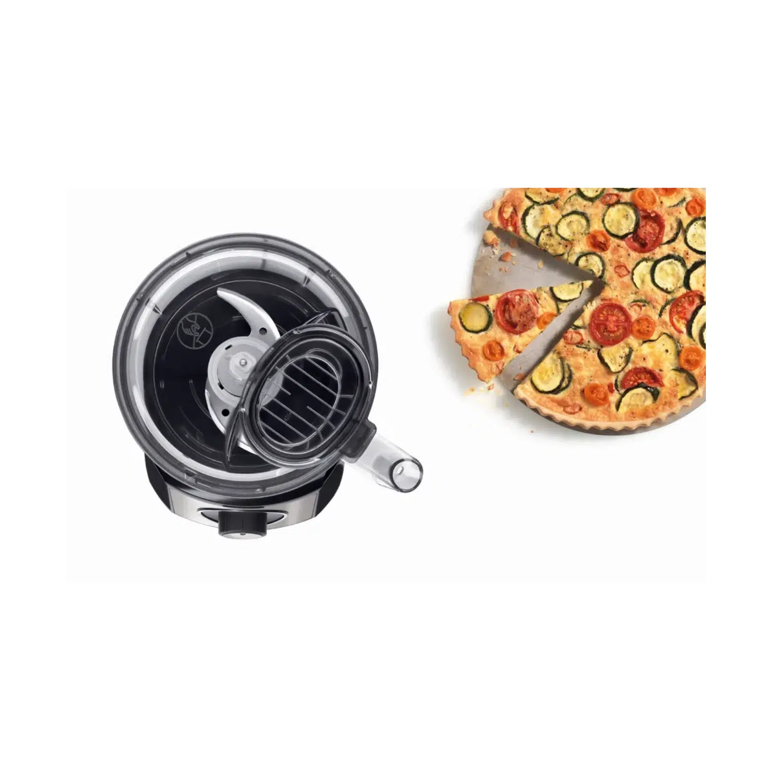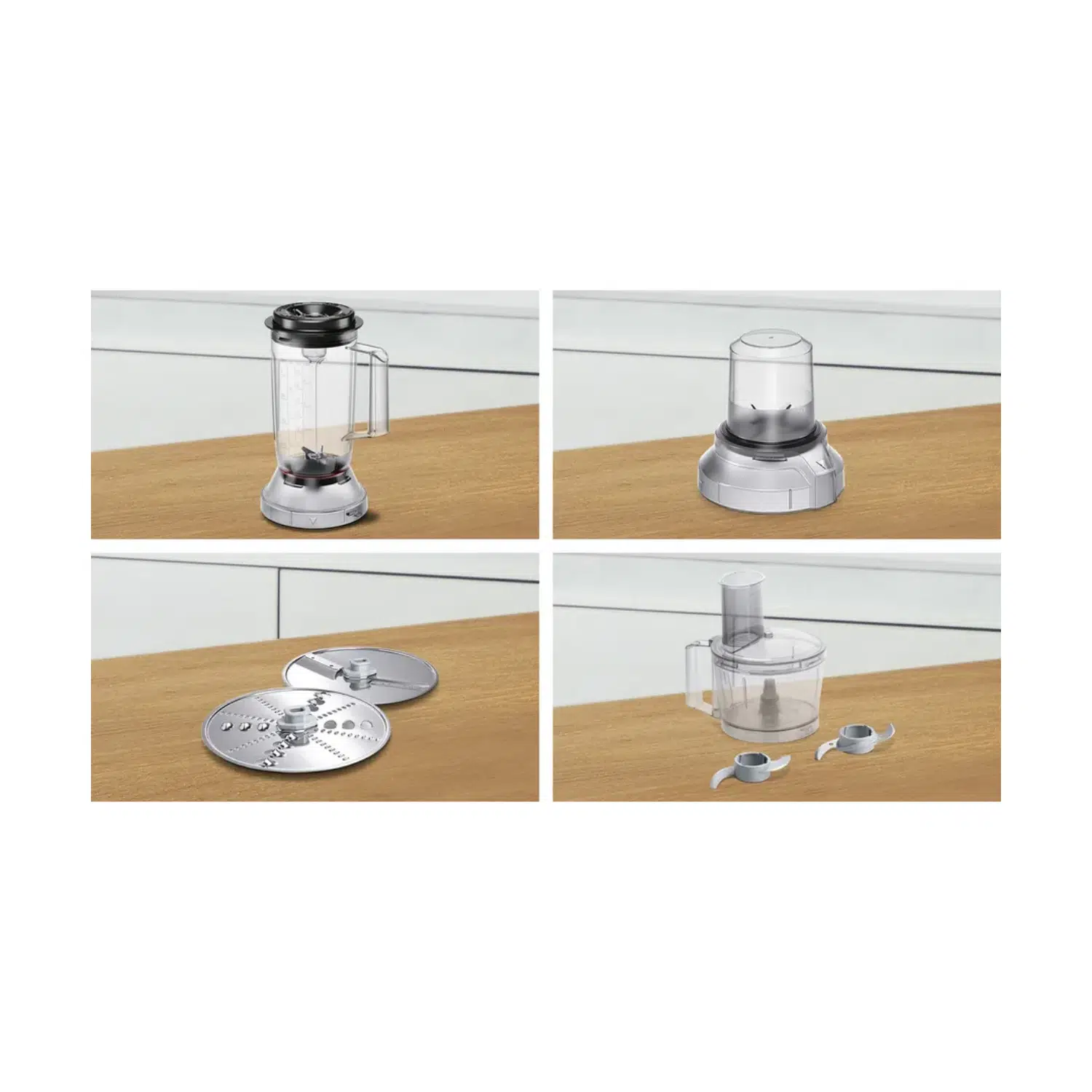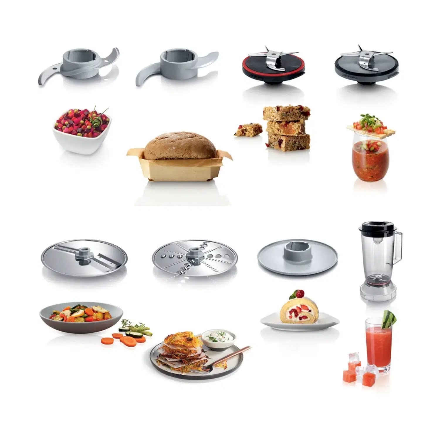 Entegre aksesuarlar: 1 x Kapak, 1 x Plastik karıştırma kabı 500gr, 1 x Mikser parçası, plastik, 1 x Çevrilebilir raspa diski, 1 x Çırpma diski, 1 x Çift taraflı kesme diski, 1 x Bastırma parçası, 1 x Üniversal bıcak, 1 x Üniversal dograyıcı, 1 x Aksesuar takma parçası