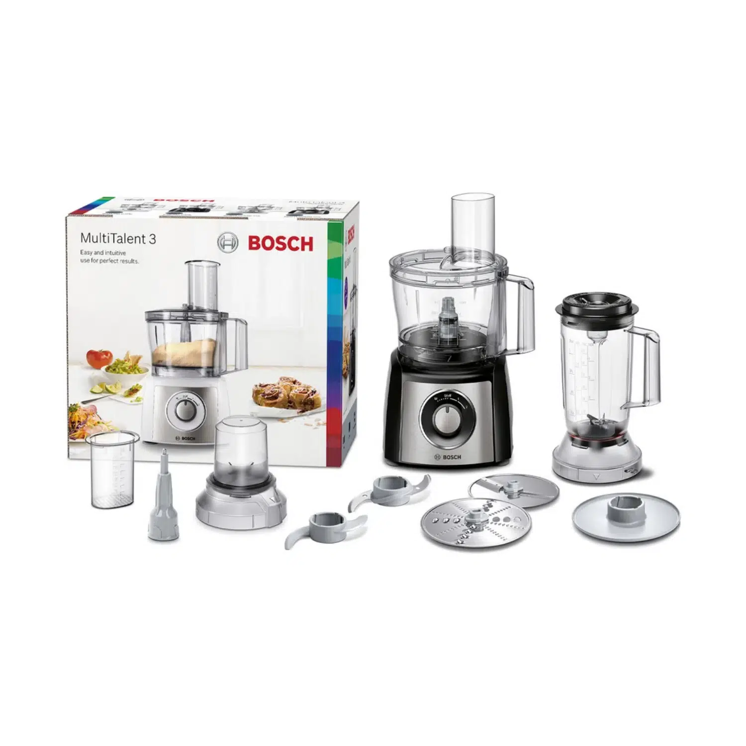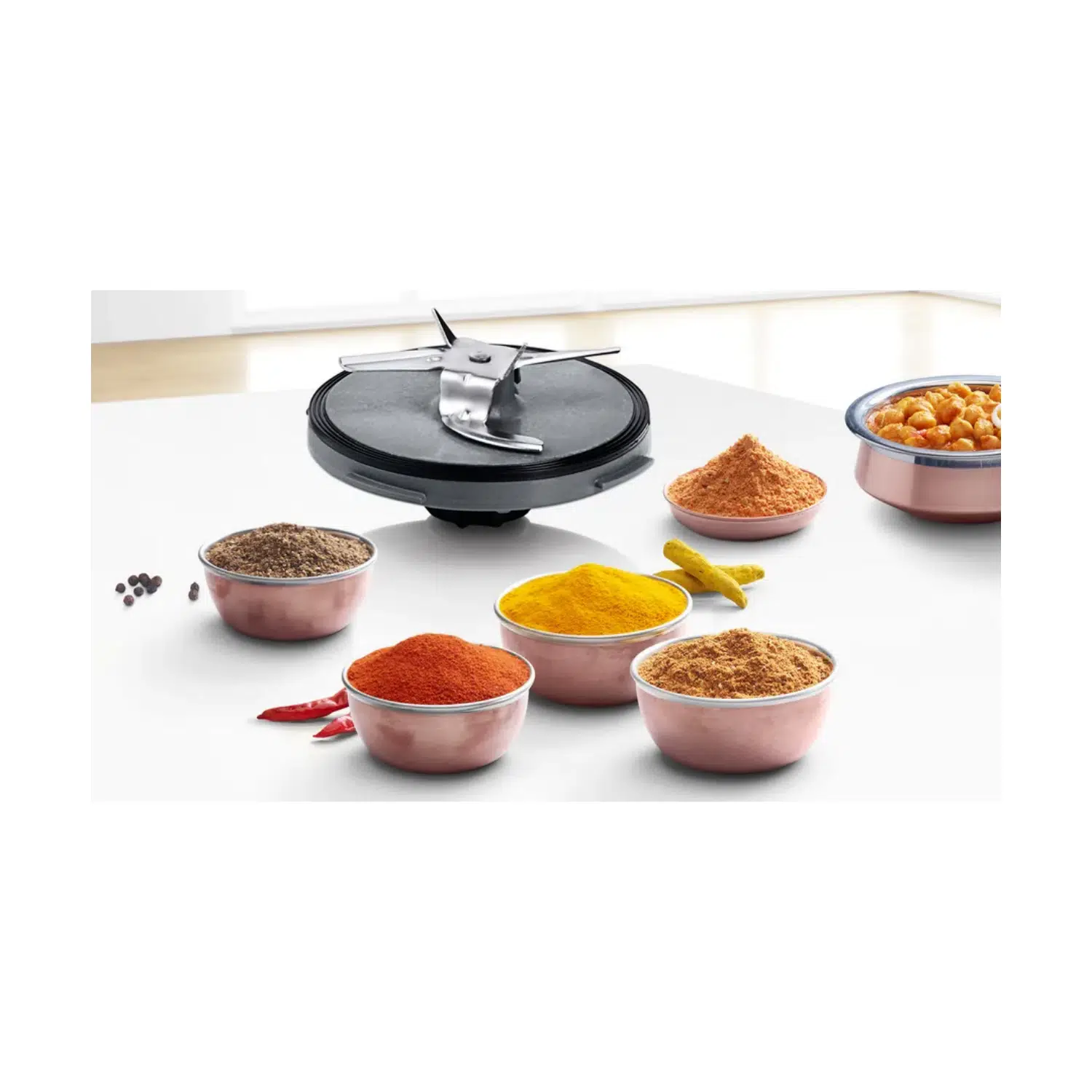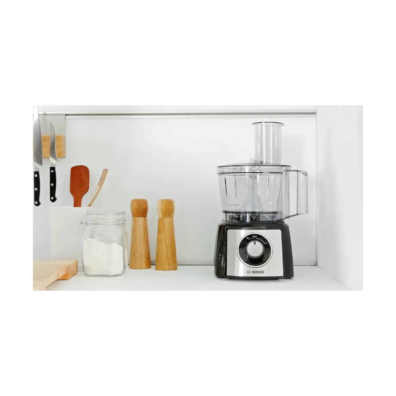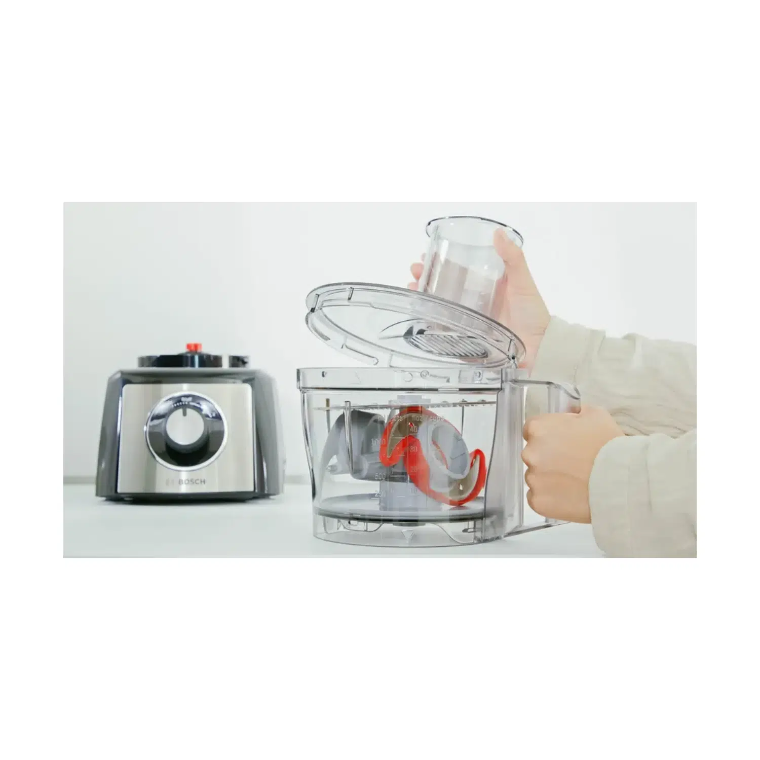 Entegre aksesuarlar: 1 x Kapak, 1 x Plastik karıştırma kabı 500gr, 1 x Mikser parçası, plastik, 1 x Çevrilebilir raspa diski, 1 x Çırpma diski, 1 x Çift taraflı kesme diski, 1 x Bastırma parçası, 1 x Üniversal bıcak, 1 x Üniversal dograyıcı, 1 x Aksesuar takma parçası