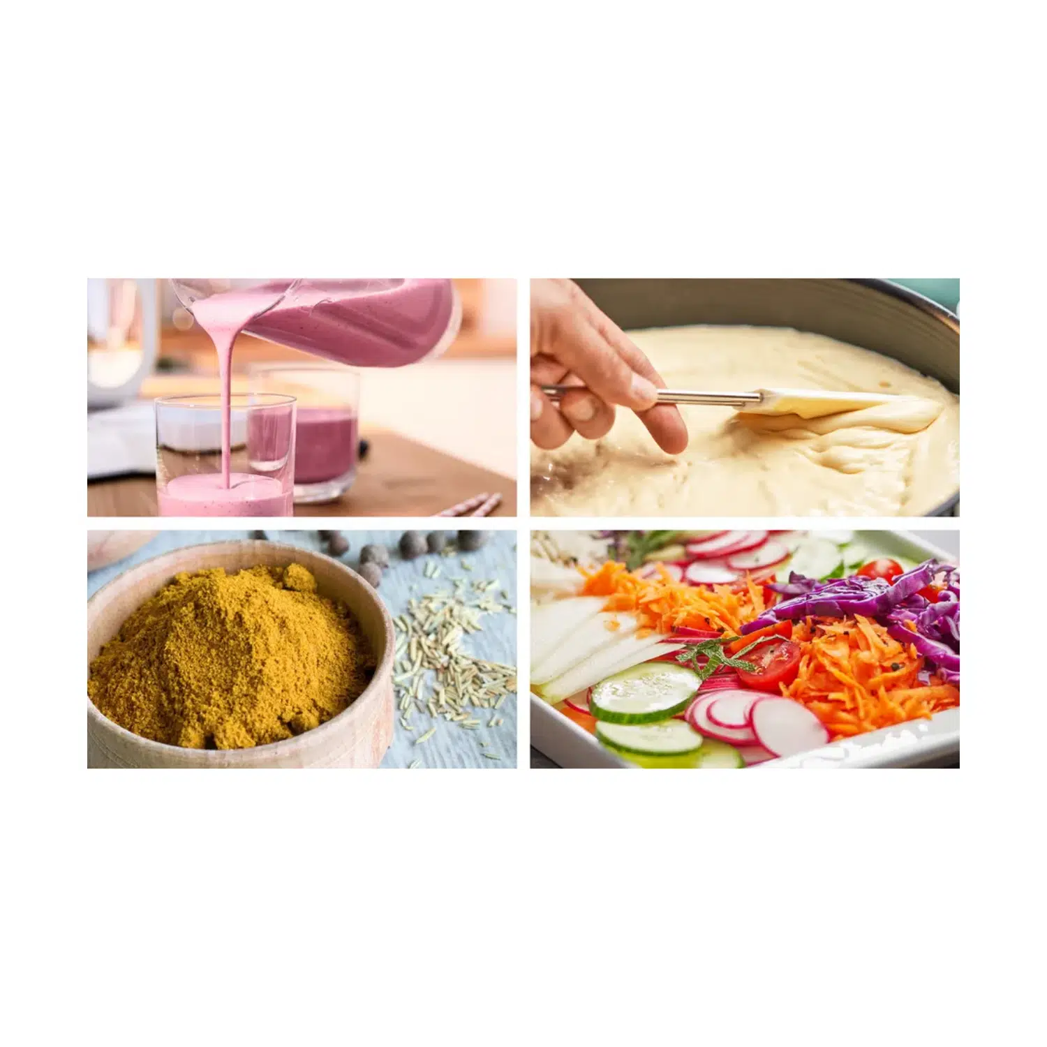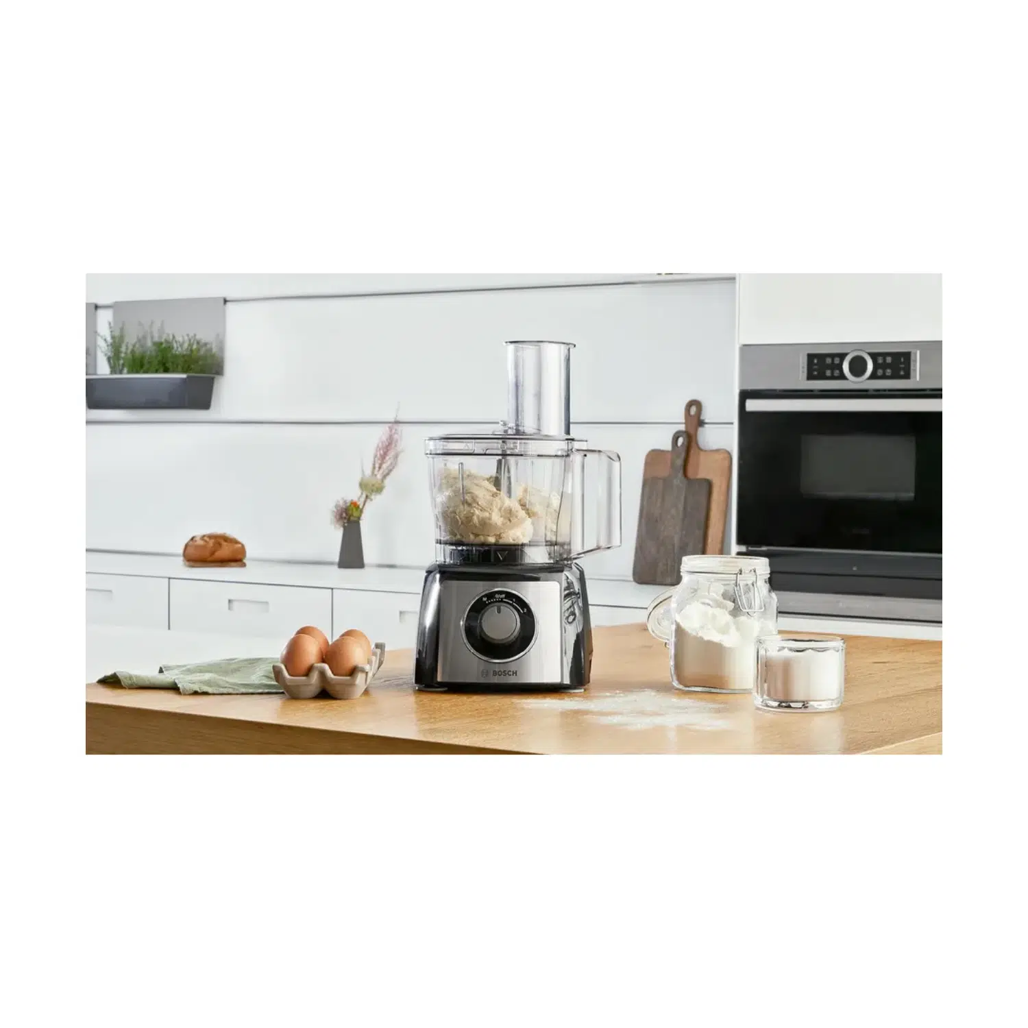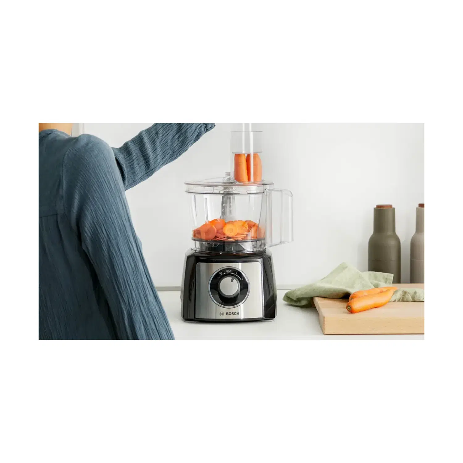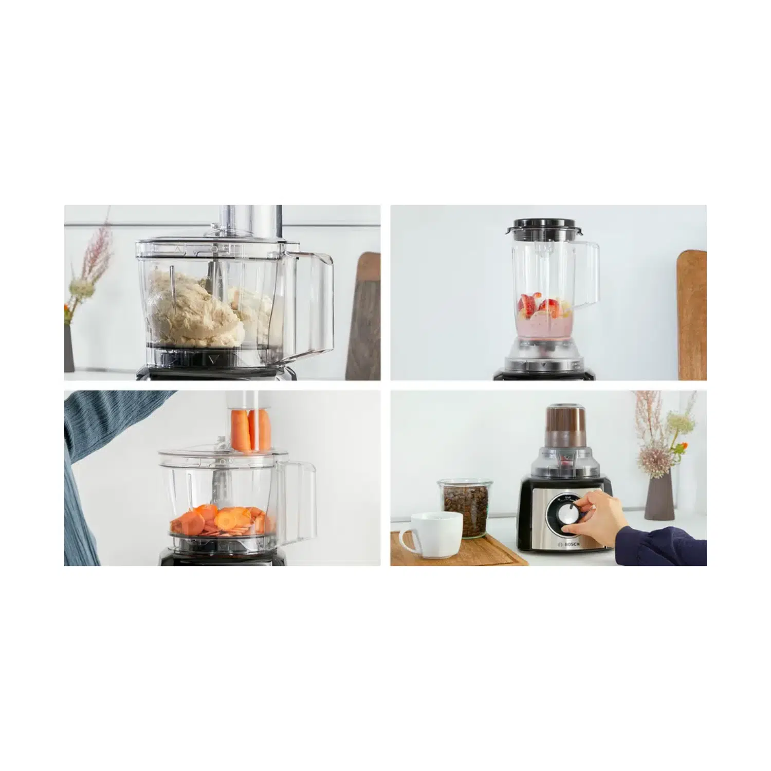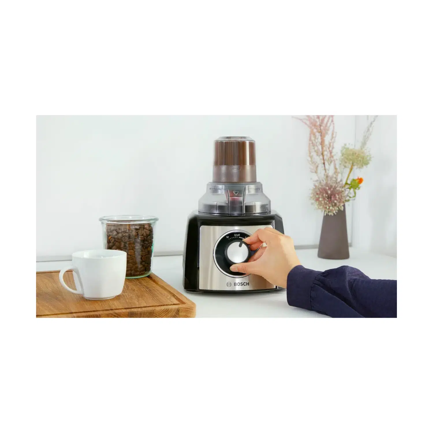 Entegre aksesuarlar: 1 x Kapak, 1 x Plastik karıştırma kabı 500gr, 1 x Mikser parçası, plastik, 1 x Çevrilebilir raspa diski, 1 x Çırpma diski, 1 x Çift taraflı kesme diski, 1 x Bastırma parçası, 1 x Üniversal bıcak, 1 x Üniversal dograyıcı, 1 x Aksesuar takma parçası