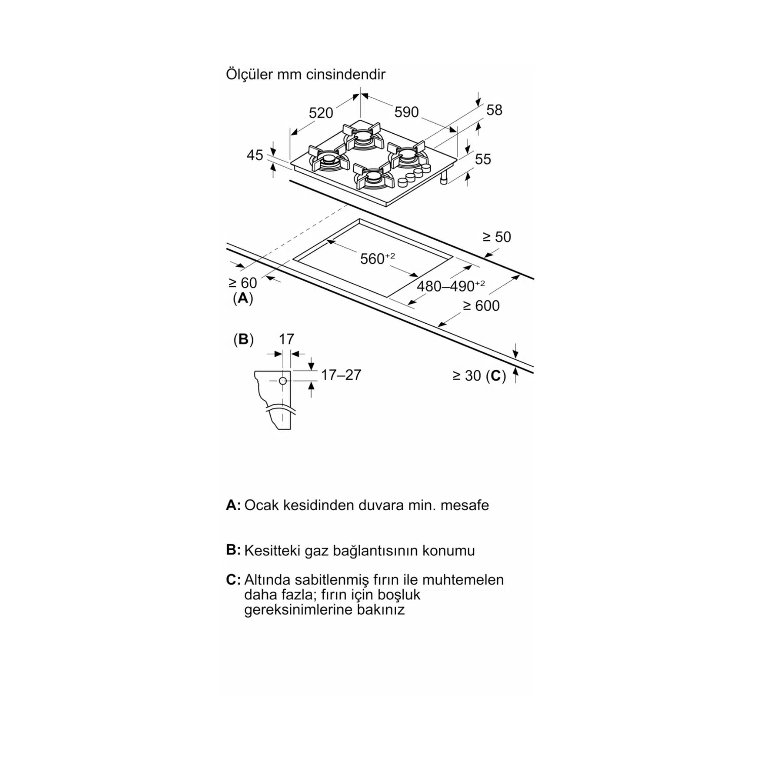 Kurulum İçin Gerekli Yuva Ölçüleri: 45 X 560-562 X 480-490 Mm